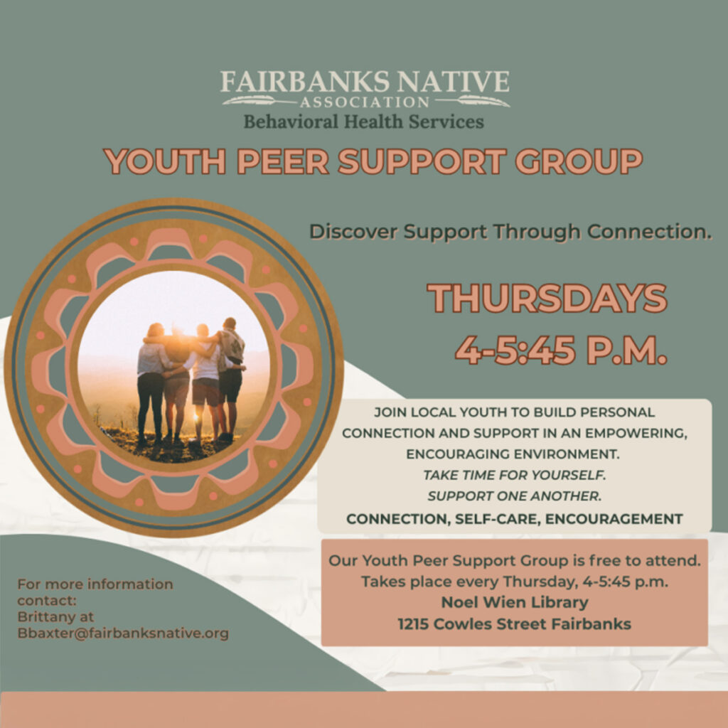 Youth Peer Support Group Every Thursday, 5-6 p.m. 615 Bidwell Ave. Ste. 103 FOR MORE INFORMATION CONTACT: BRITTANY AT BBAXTER@FAIRBANKSNATIVE.ORG