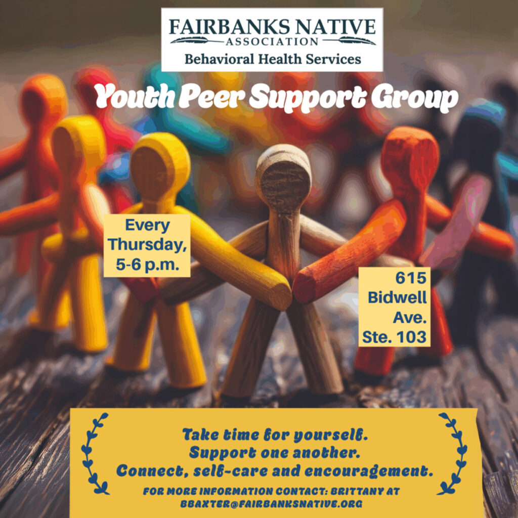 Youth Peer Support Group Every Thursday, 5-6 p.m. 615 Bidwell Ave. Ste. 103 FOR MORE INFORMATION CONTACT: BRITTANY AT BBAXTER@FAIRBANKSNATIVE.ORG